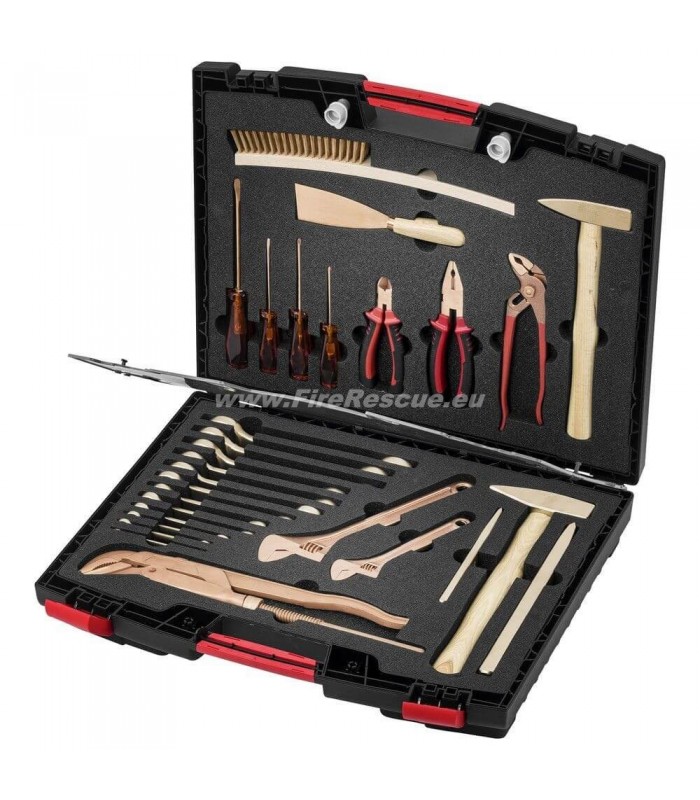 Komplet neiskrečega ključavničarskega orodje v kovčku za uporabo v potencialno eksplozivnem okolju.
