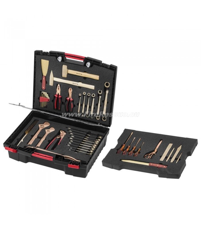 Komplet neiskrečega tehničnega orodja v kovčku za uporabo v potencialno eksplozivnem okolju.