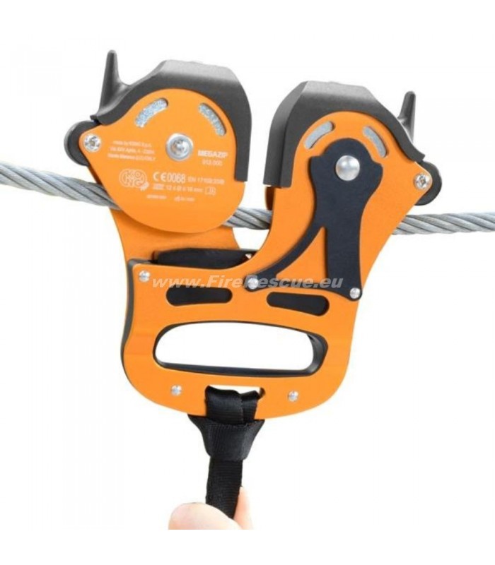 Dvojni škripec za dolge in hitre zipline (nad 300 m). Zasnovan za uporabo na kablih 12 do 16 mm.