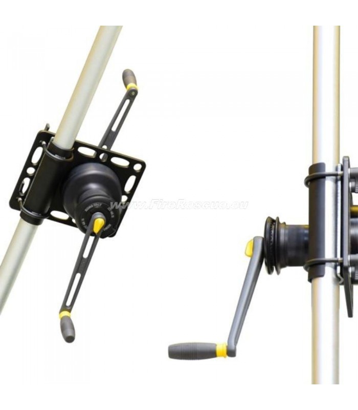 Reševalni komplet, sestavljen iz vitla*, aluminijaste plošče z več pritrdilnimi točkami in mobilne čeljusti iz nerjavečega jekla, ki omogoča montažo sistema na najpogostejše cevne konstrukcije premera od 48 do 50 mm.