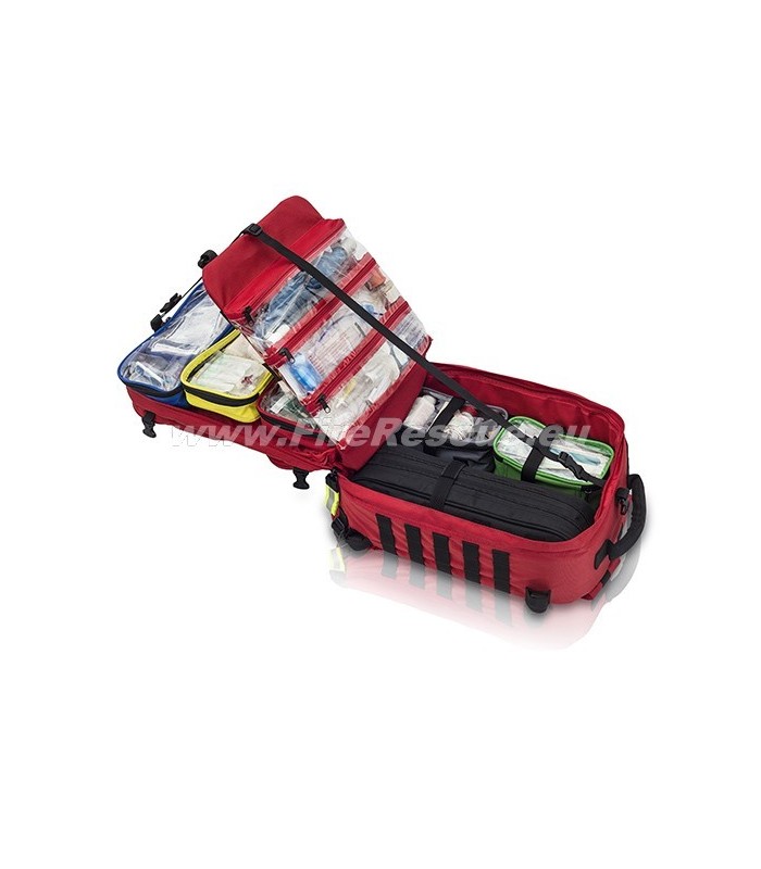 Komplet prve pomoči C v skladu z Tipizacijo Gasilske zveze Slovenije za gasilska vozila. Vsa oprema je nameščena v kakovostnem, preglednem in funkcionalnem nahrbtniku prve pomoči Elite Bags Paramedic XL v rdeči barvi.