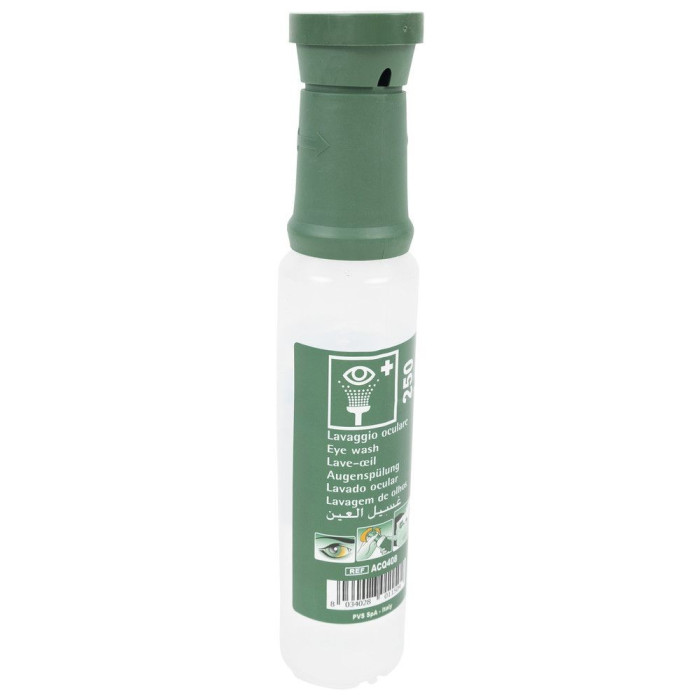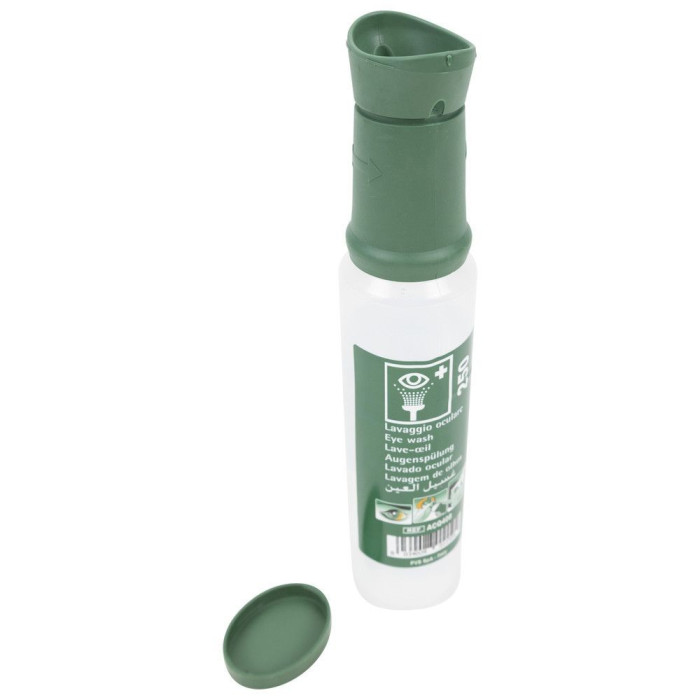 Steklenička s sterilno raztopino natrijevega klorida (0,9%). Opremljena z ergonomsko oblikovanim očescem in pokrovčkom za prah. Steklenička je primerna za polnjenje postaje za izpiranje oči in za enkratno uporabo.