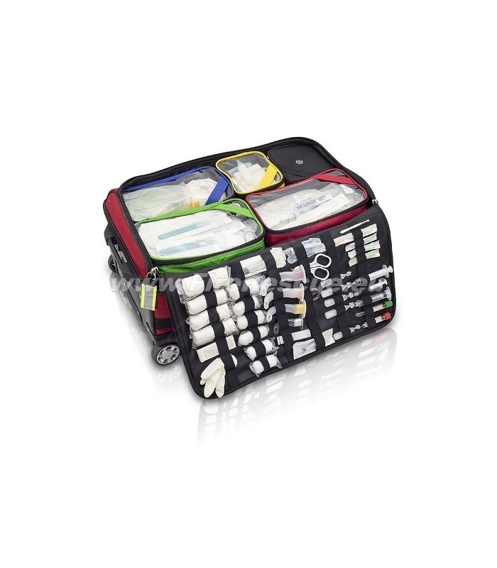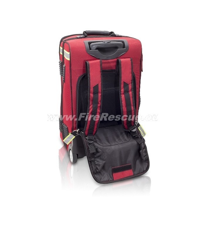 Velika reanimacijska torba za reševalce z vgrajenim vozičkom, omogoča udoben prevoz in dostop do potrebnih orodij za strokovnjake.