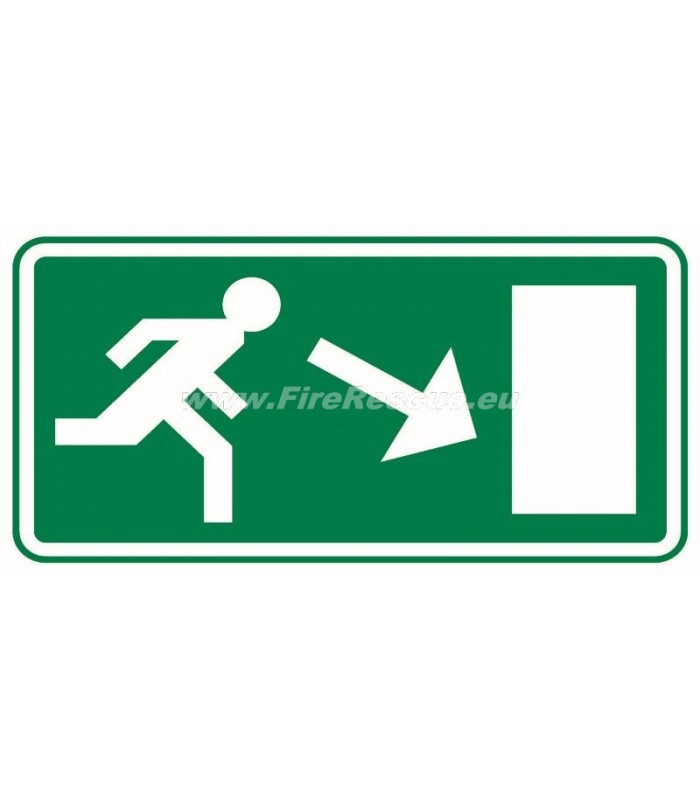 Opozorilna evakuacijska nalepka smer evakuacije DESNO DOL, ki jo namestimo nad izhod iz stavbe v javnih prostorih, za označbo izhoda iz objekta. Namenjena je le notranji uporabi.
