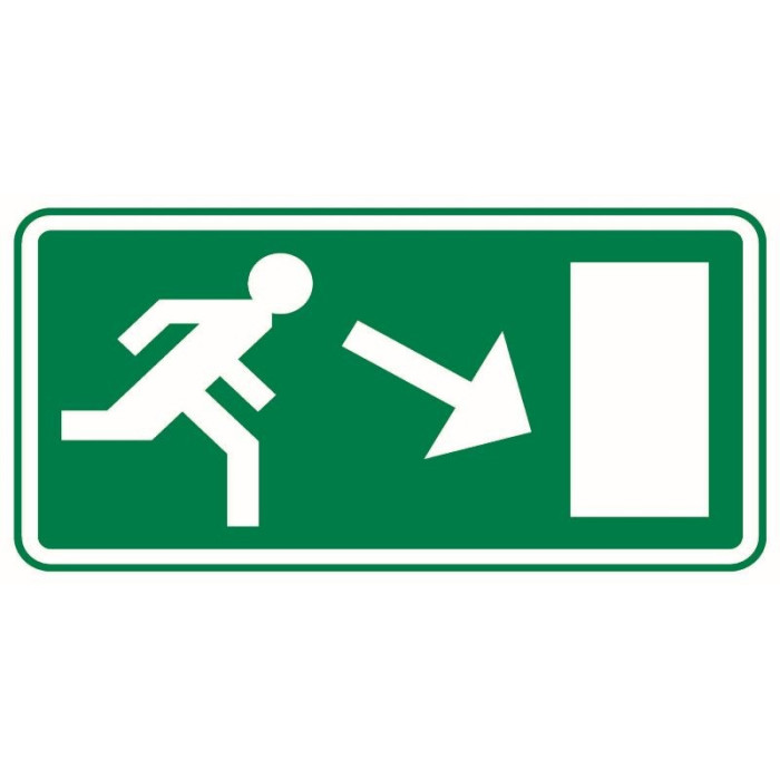 Opozorilna evakuacijska tablica smer evakuacije DESNO DOL, ki jo namestimo nad izhod iz stavbe v javnih prostorih, za označbo izhoda iz objekta. Namenjena je le notranji uporabi.
