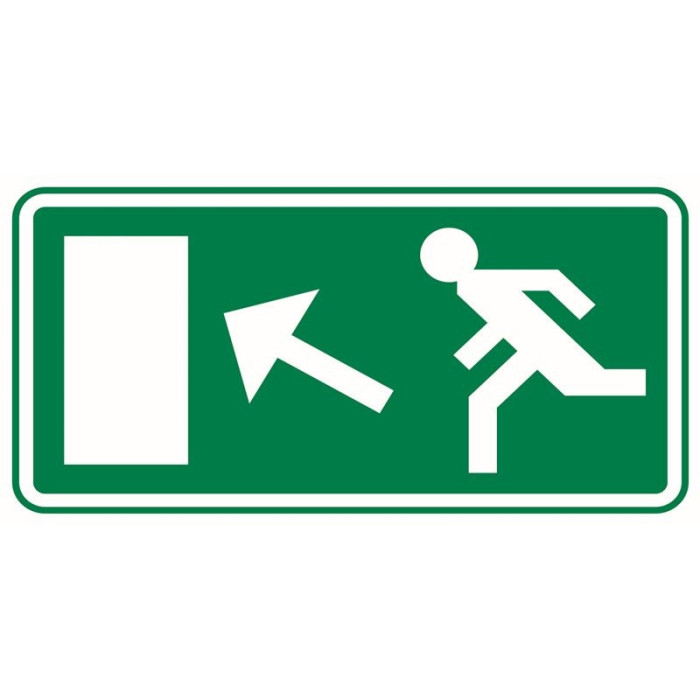 Opozorilna evakuacijska tablica smer evakuacije LEVO GOR, ki jo namestimo nad izhod iz stavbe v javnih prostorih, za označbo izhoda iz objekta. Namenjena je le notranji uporabi.